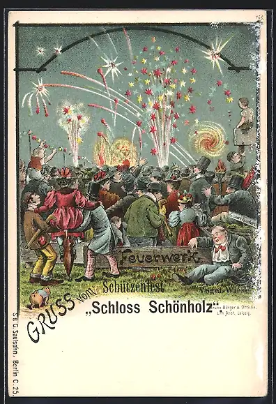 Lithographie Dresden, Vogelwiese, Nächtliches Feuerwerk