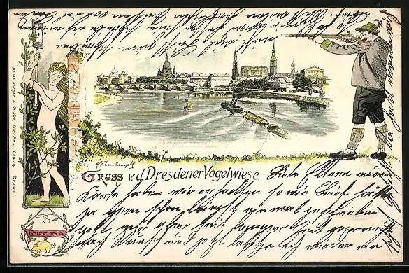 Lithographie Dresdener Vogelwiese, Ortsansicht, Schütze mit Gewehr ziehlt auf eine Zielscheibe