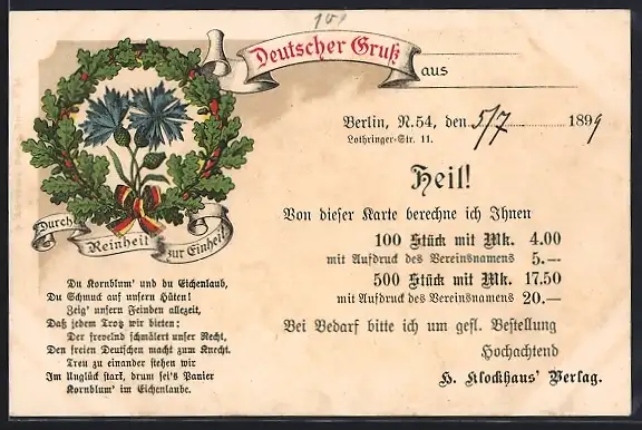 Lithographie Du Kornblum und du Eichenlaub..., Gedicht, Ehrenkranz mit Schleife in Schwarzrotgold
