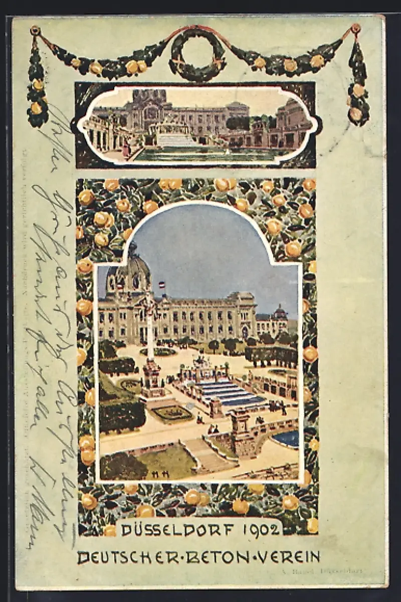 Lithographie Düsseldorf, Ausstellung 1902, Deutscher Beton-Verein, Ausstellungsgebäude mit Denkmal
