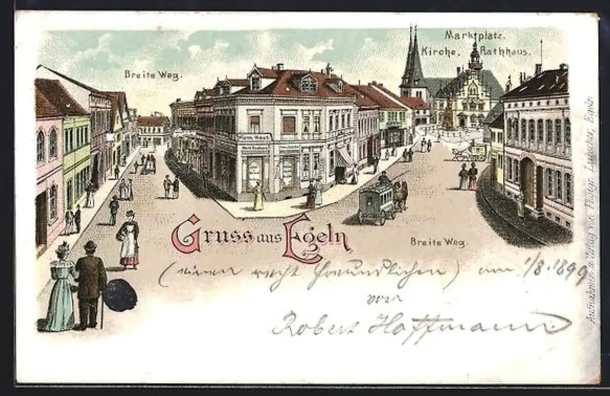 Lithographie Egeln, Breite Weg, Marktplatz mit Kirche und Rathaus