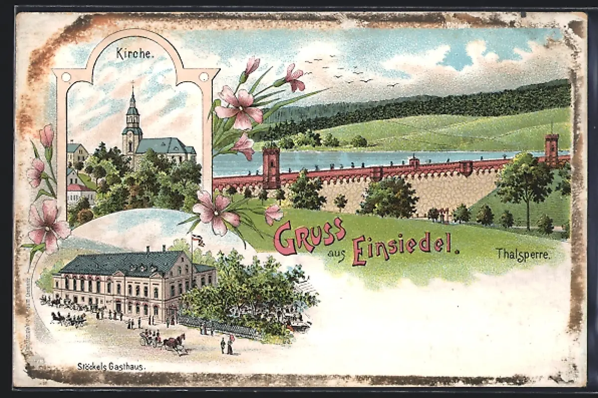Lithographie Einsiedel / Chemnitz, Kirche, Stöckels Gasthaus, Thalsperre