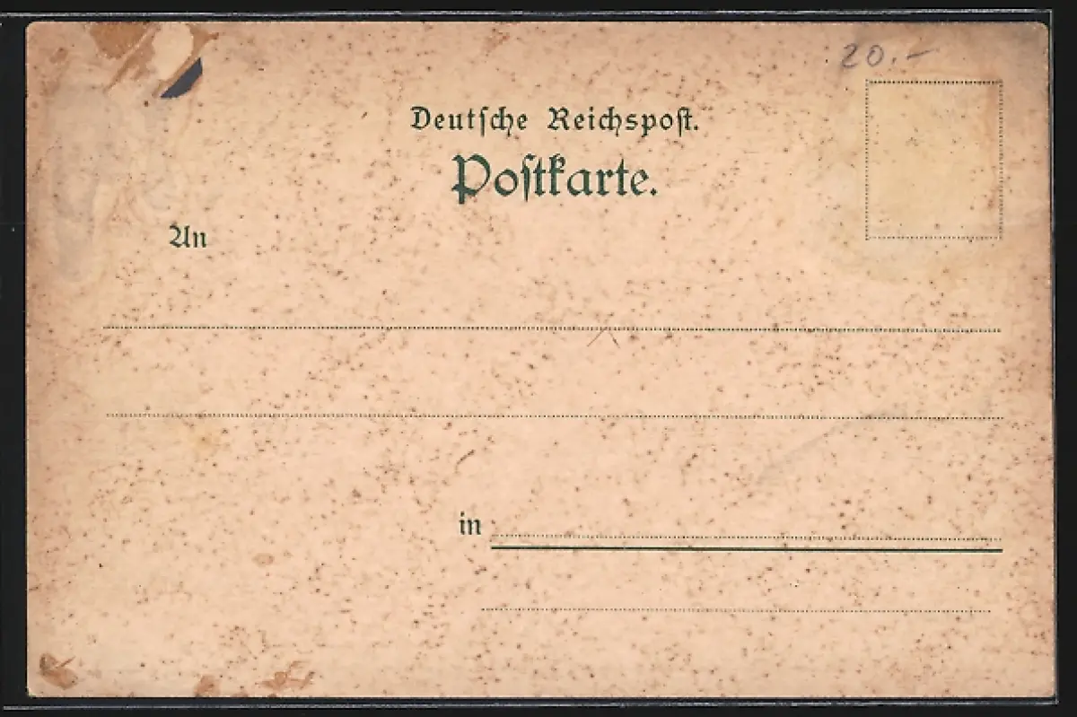 Personenbezogene Daten auf der Rückseite der Karte wurden durch blauen Textmarker unkenntlich gemacht. Die blauen Stellen sind auf die Vorderseite durchgeweicht und wirken sich negativ auf das Postkartenfoto aus