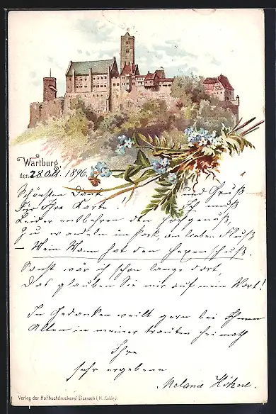 Lithographie Eisenach, Wartburg, Vergissmeinnicht