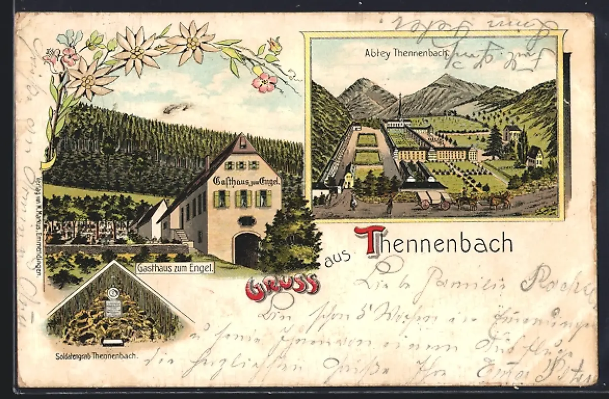 Lithographie Emmendingen, Gasthaus zum Engel, Abtei Tennenbach und Soldatengrab
