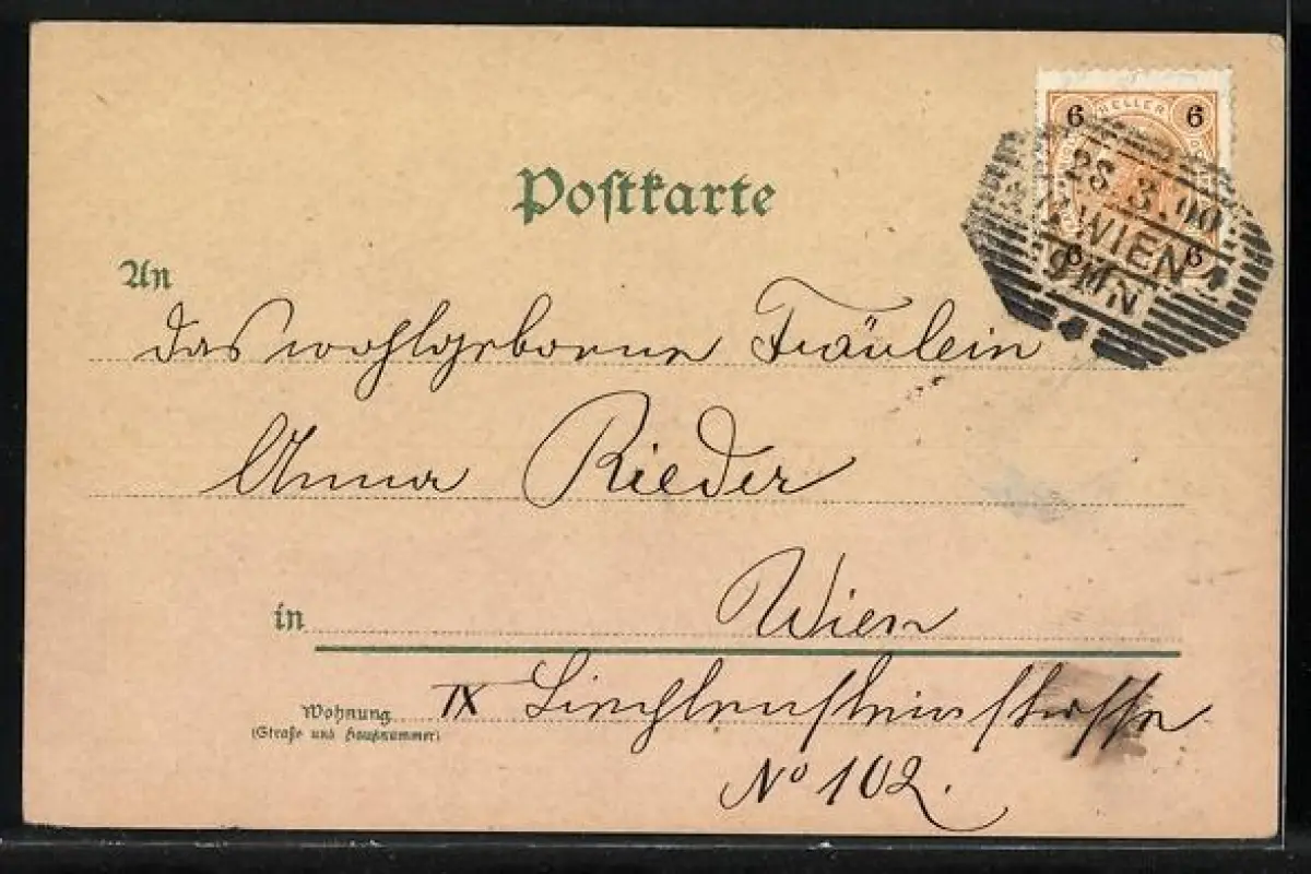 Personenbezogene Daten auf der Rückseite der Karte wurden durch blauen Textmarker unkenntlich gemacht. Die blauen Stellen sind auf die Vorderseite durchgeweicht und wirken sich negativ auf das Postkartenfoto aus