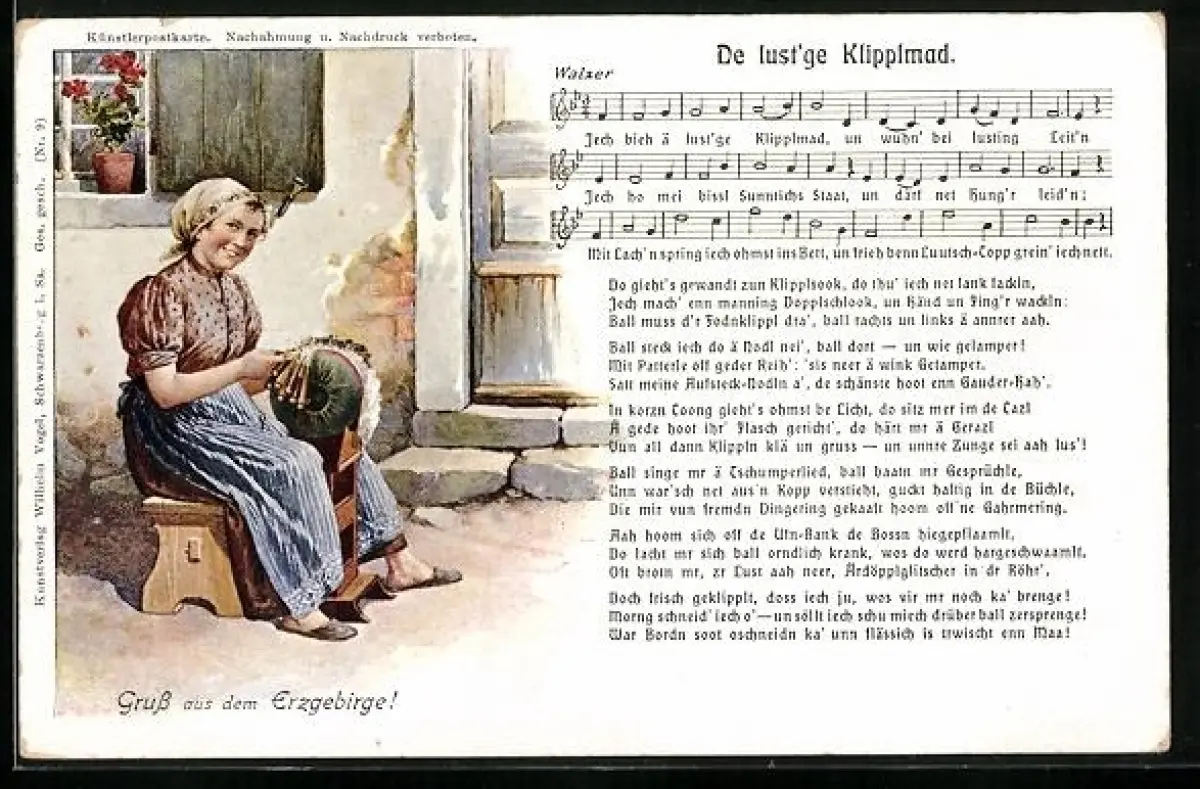 Lithographie Erzgebirge, Frau beim klöppeln, Lied De lust`ge Klipplmad