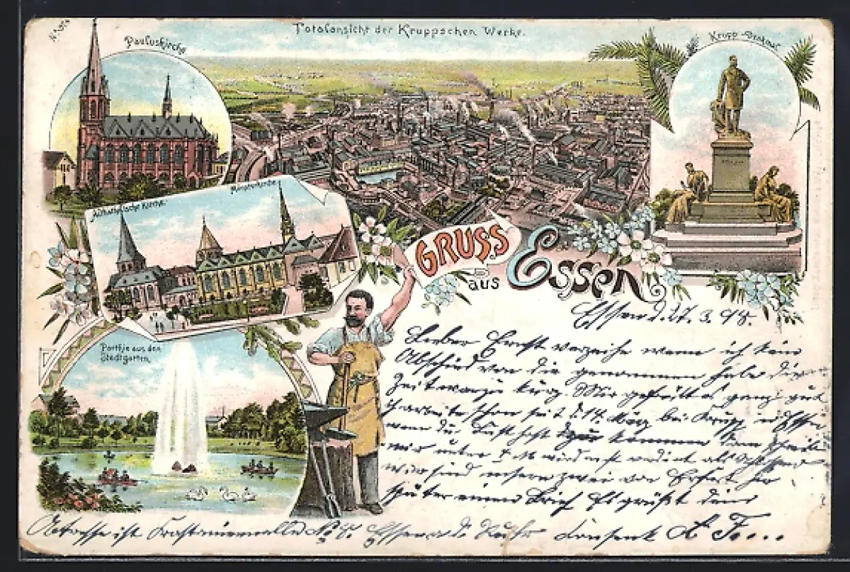 Lithographie Essen, Gesamtansicht der Kruppschen Werke, Krupp-Denkmal, Pauluskirche, Münsterkirche, Stadtgarten