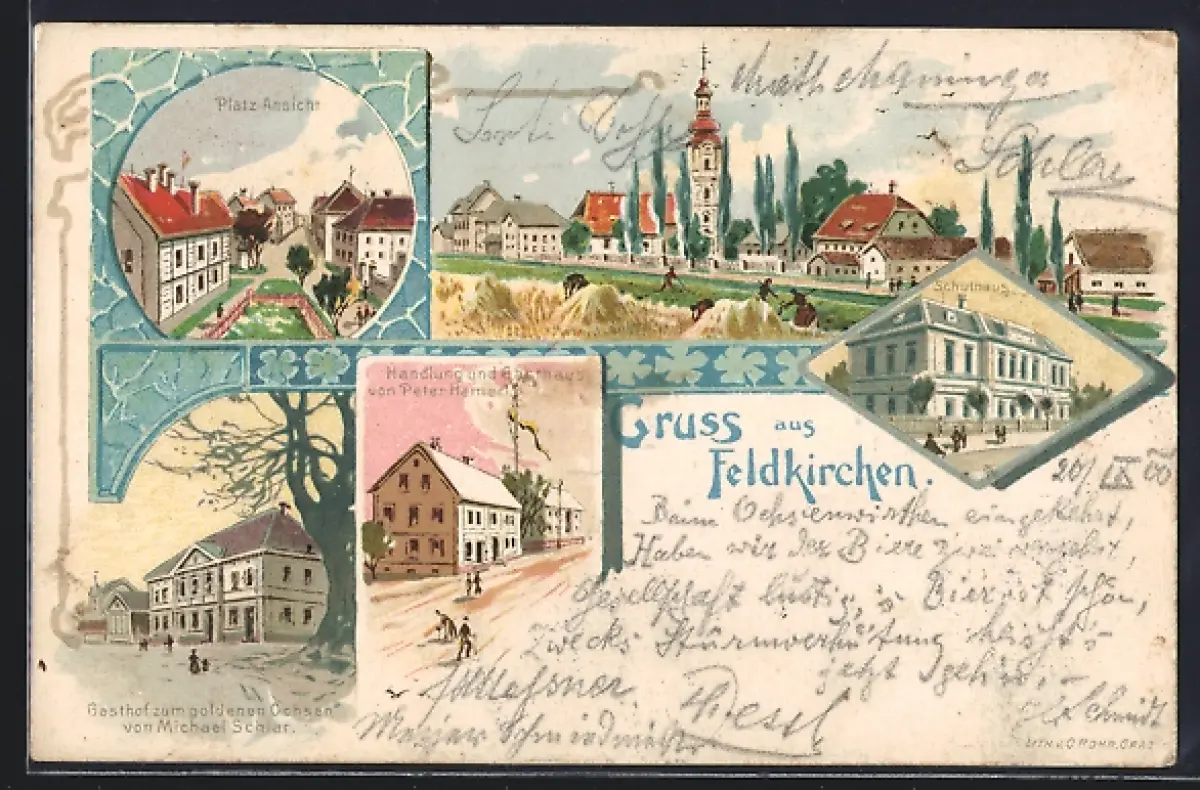 Lithographie Feldkirchen, Gasthof zum goldenen Ochsen, Handlung und Gasthaus von Peter Hamerl