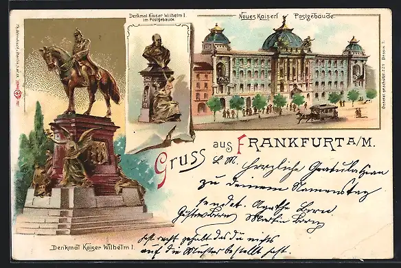 Lithographie Frankfurt, kaiserliche Post und Denkmal Kaiser- Wilhelm I.