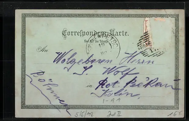 Personenbezogene Daten auf der Rückseite der Karte wurden durch blauen Textmarker unkenntlich gemacht. Die blauen Stellen sind auf die Vorderseite durchgeweicht und wirken sich negativ auf das Postkartenfoto aus