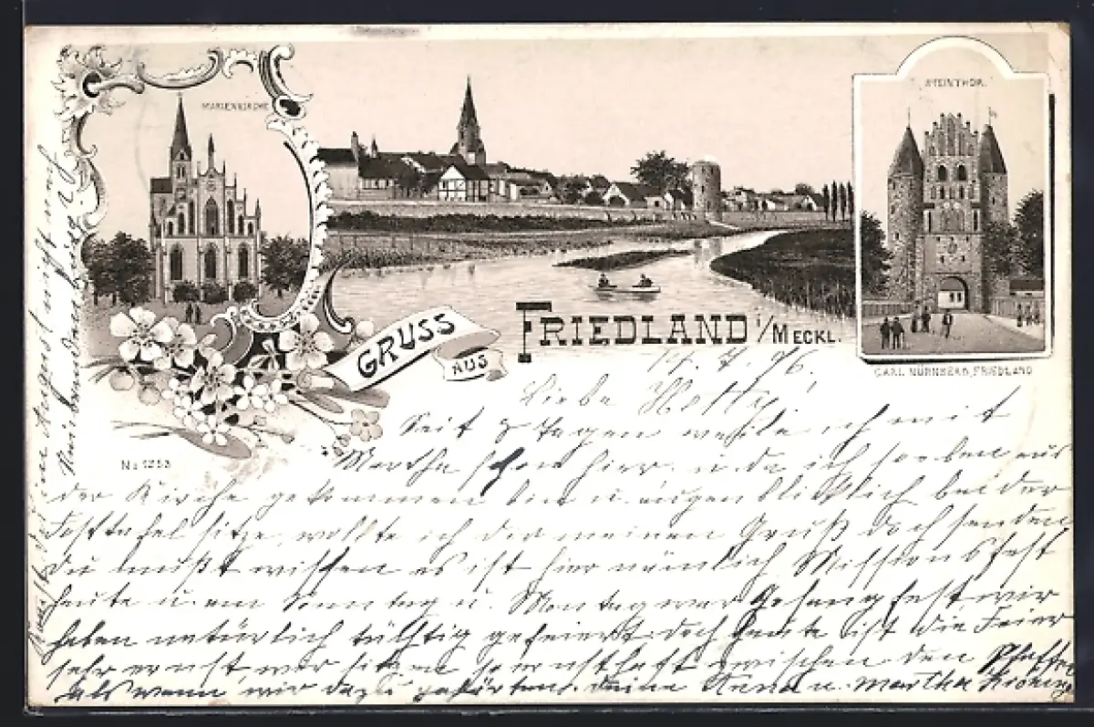 Lithographie Friedland i. Meckl., Marienkirche, Steinthor, Ortsansicht