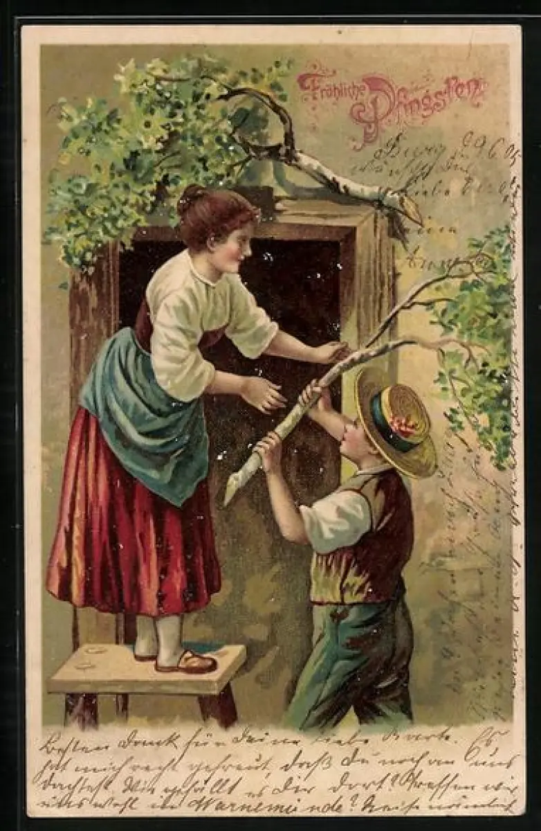Lithographie Fröhliche Pfingsten, Junge und Mädchen verladen Birkenzweige