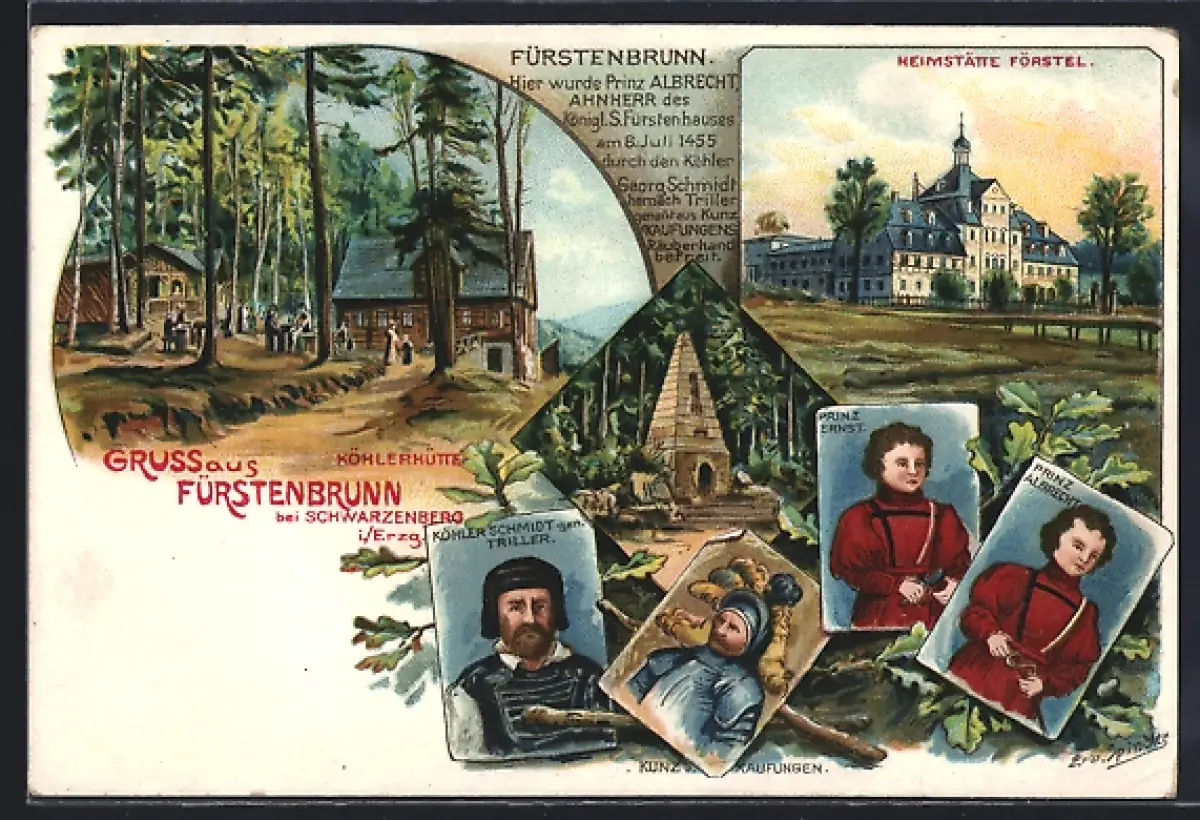 Lithographie Fürstenbrunn bei Schwarzenberg, Gasthaus Heimstätte Förstel, Köhlerhütte
