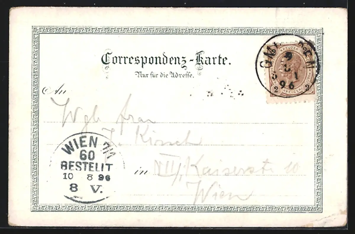 gelaufen 1896, Eckknick li. unten, Bugspur re. oben, guter Zustand