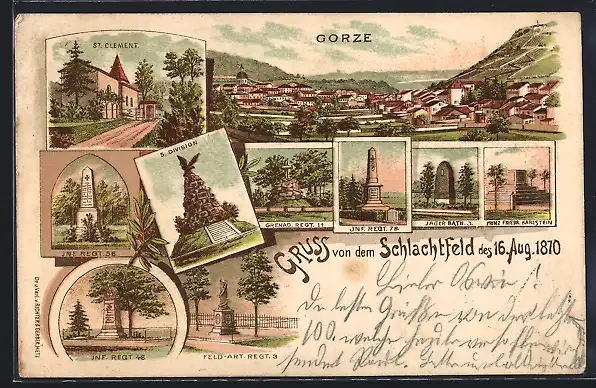 Lithographie Gorze, St. Clement, Denkmäler der Inf.-Rgt. 56, Inf-Rgt. 48, 5. Division, Grenad-Rgt. 11, Jäger Batl. 3