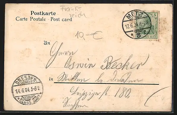 gelaufen 1904, Eckknick oben li., guter Zustand