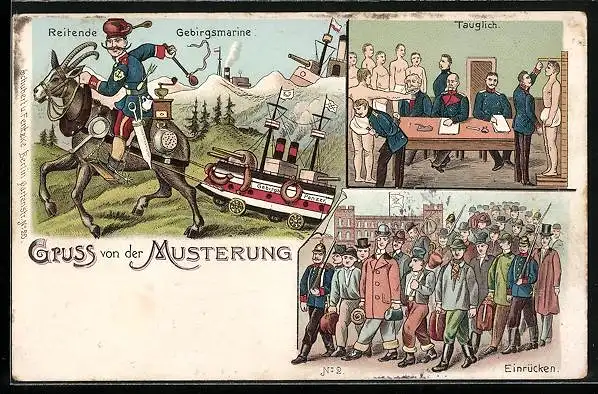 Lithographie Gruss von der Musterung, Reitende Gebirgsmarine mit Kaffeemühle