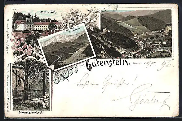 Lithographie Gutenstein, Maria Hilf, Klosterthal mit Schneeberg, Raimund Denkmal, Panorama