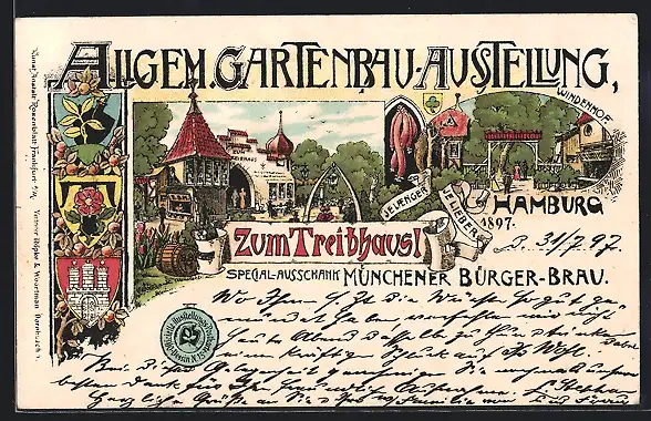 Lithographie Hamburg, Allgem. Gartenbau-Ausstellung 1897, Gasthäuser Zum Treibhausl & Windenhof