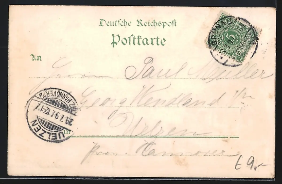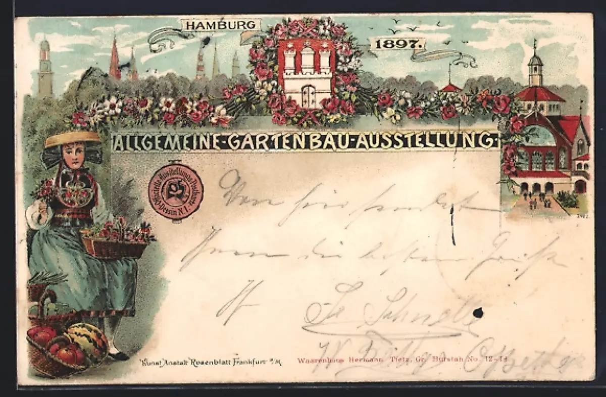 Lithographie Hamburg, Allgemeine Gartenbau-Ausstellung 1897, Ausstellungsgebäude, Frau mit Blumenkorb, Wappen