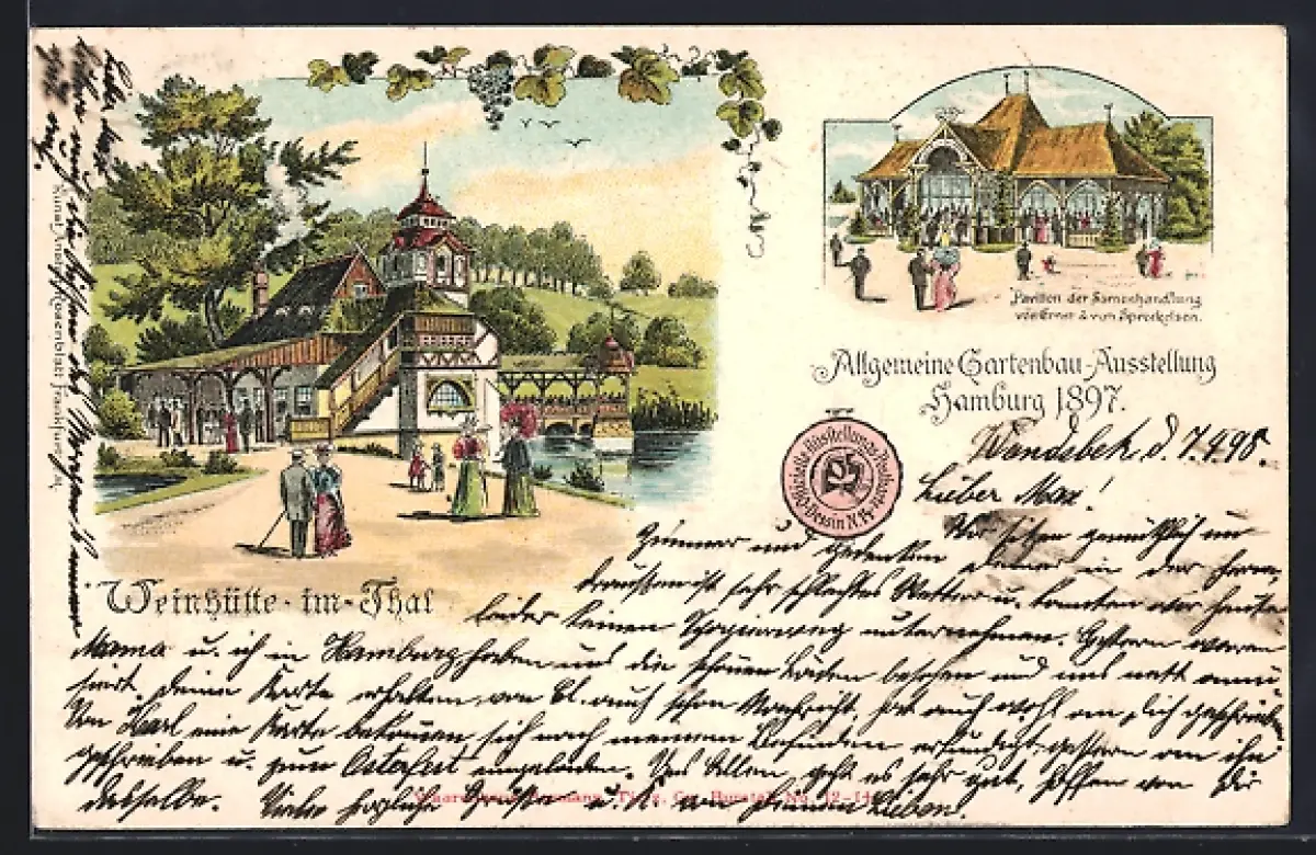 Lithographie Hamburg, Allgemeine Gartenbau-Ausstellung 1897, Gasthaus Weinshütte im Thal