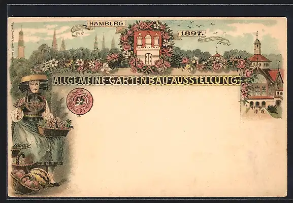 Lithographie Hamburg, Allgemeine Gartenbau-Ausstellung 1897, Hamburger Blumenmädchen