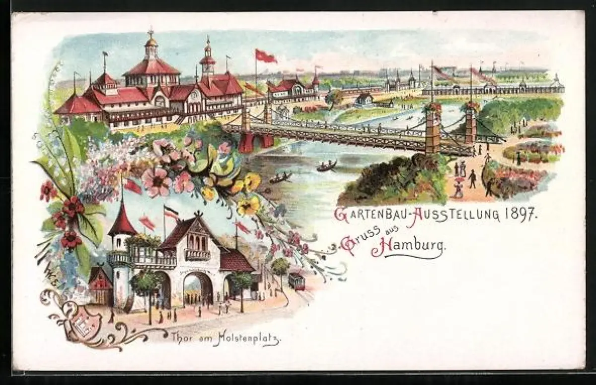 Lithographie Hamburg, Allgemeine Gartenbau-Ausstellung 1897, Thor am Holstenplatz