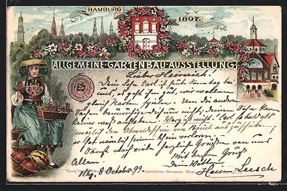 Lithographie Hamburg, Allgemeine Gartenbau-Ausstellung 1897, Wappen und Frau in Tracht