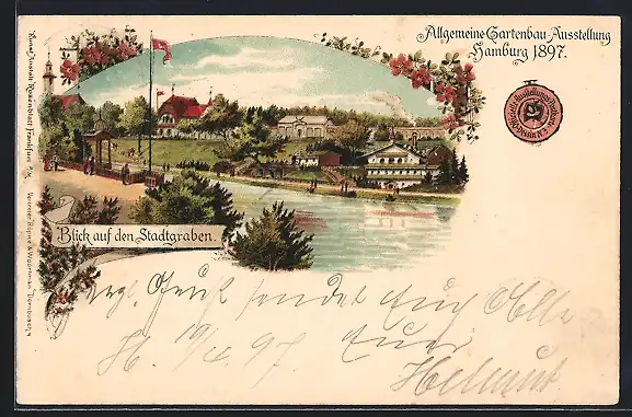 Lithographie Hamburg, Allgemeine Gartenbau-Ausstellung 1897 mit Blick auf den Stadtgraben, rote Blumen