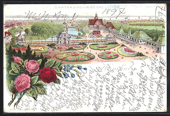 Lithographie Hamburg, Allgemeine Gartenbau-Ausstellung, Gelände aus der Vogelschau