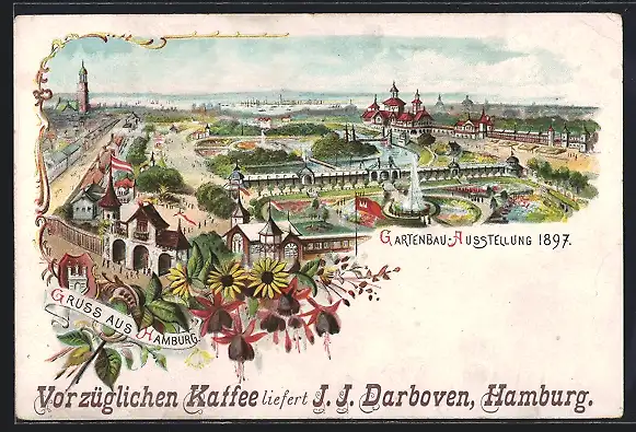 Lithographie Hamburg, Gartenbau-Ausstellung 1897, Ortspartie aus der Vogelschau