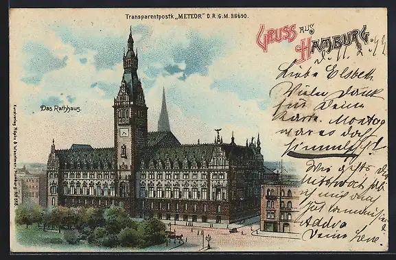 Lithographie Hamburg, Totalansicht des Rathauses, Halt gegen das Licht: bei Nacht