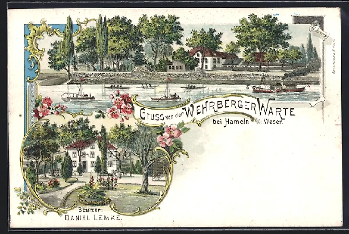 Lithographie Hameln a. d. Weser, Gasthof Wehrberger Warte, Besitzer Daniel Lemke