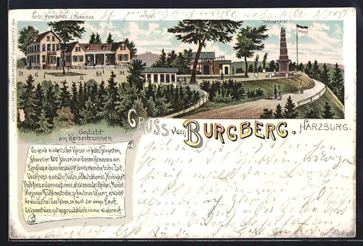 Lithographie Harzburg, Gedicht zu Kaiserbrunnen, Hotel Burgberge