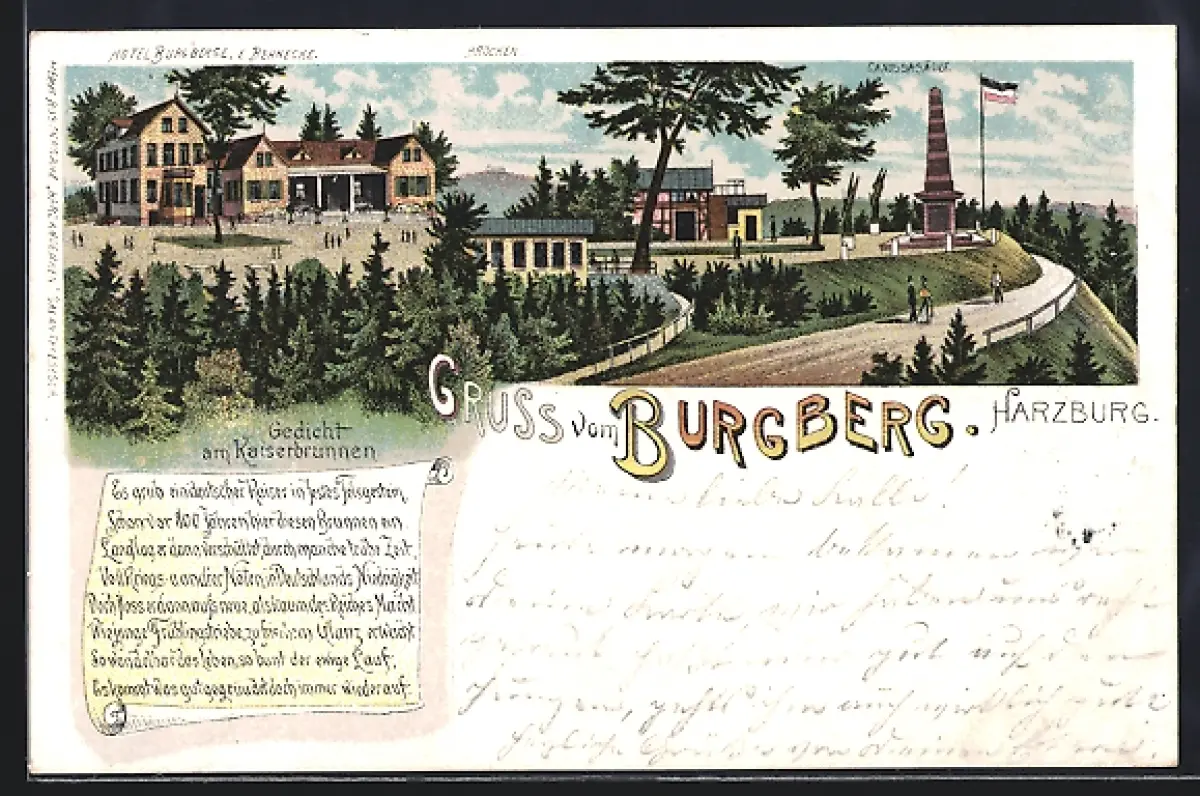 Lithographie Harzburg, Gedicht zu Kaiserbrunnen, Hotel Burgberge