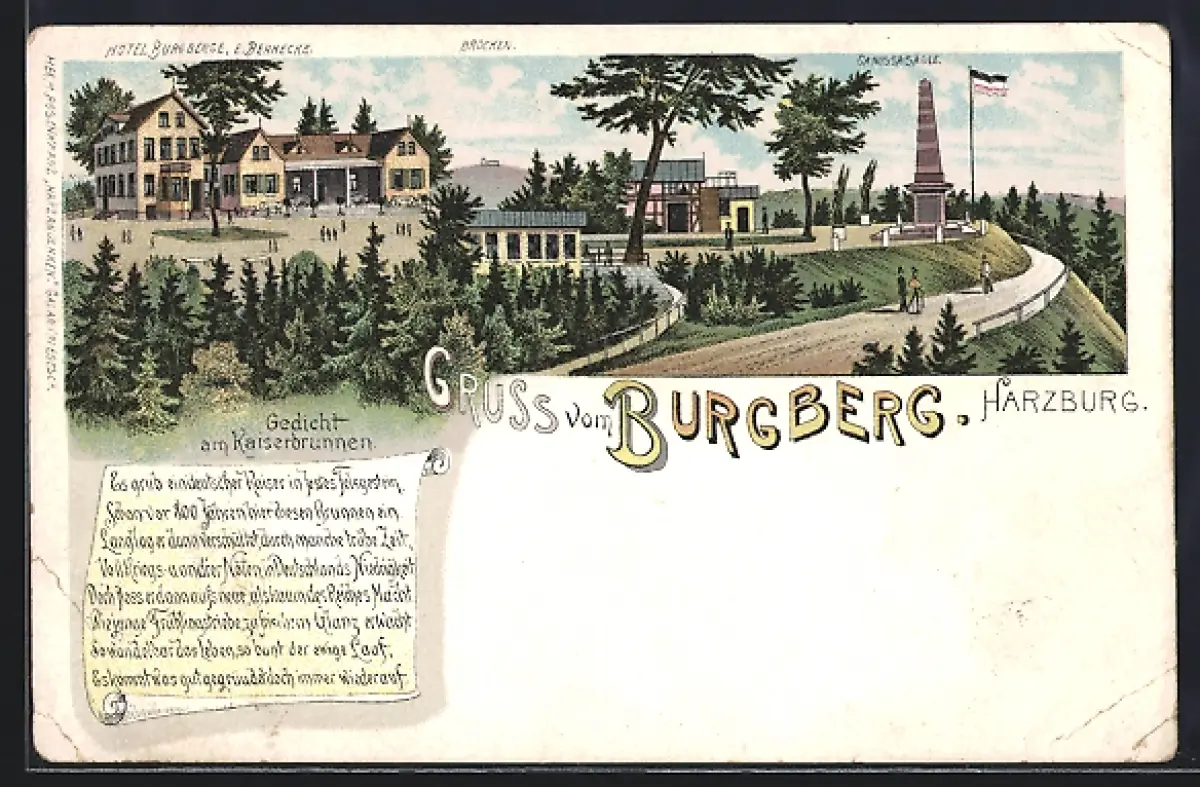 Lithographie Harzburg, Gedicht zu Kaiserbrunnen, Hotel Burgberge
