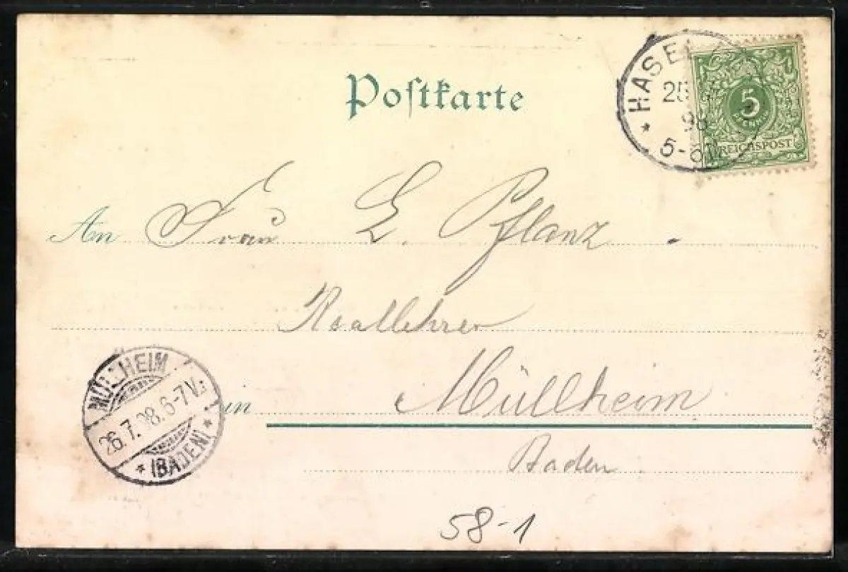 Personenbezogene Daten auf der Rückseite der Karte wurden durch blauen Textmarker unkenntlich gemacht. Die blauen Stellen sind auf die Vorderseite durchgeweicht und wirken sich negativ auf das Postkartenfoto aus