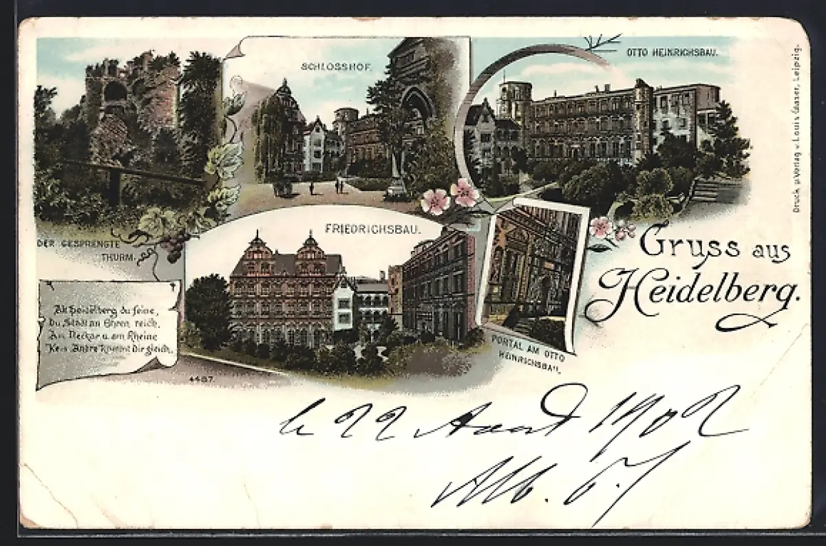 Lithographie Heidelberg, Schlosshof, Otto-Heinrichs-Bau, Friedrichsbau, Der gesprengte Turm, Reim