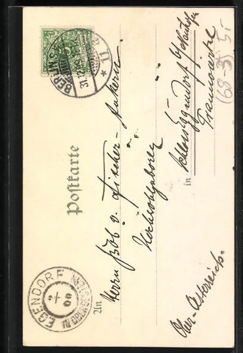 Personenbezogene Daten auf der Rückseite der Karte wurden durch blauen Textmarker unkenntlich gemacht. Die blauen Stellen sind auf die Vorderseite durchgeweicht und wirken sich negativ auf das Postkartenfoto aus