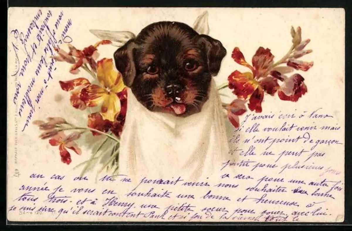 Lithographie Hundewelpe in einem zusammengeknoteten Tuch mit Blumen