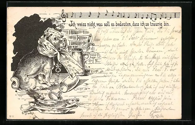 Lithographie Ich weiss nicht, was soll es bedeuten..., Hund mit Schal, Bierkrug