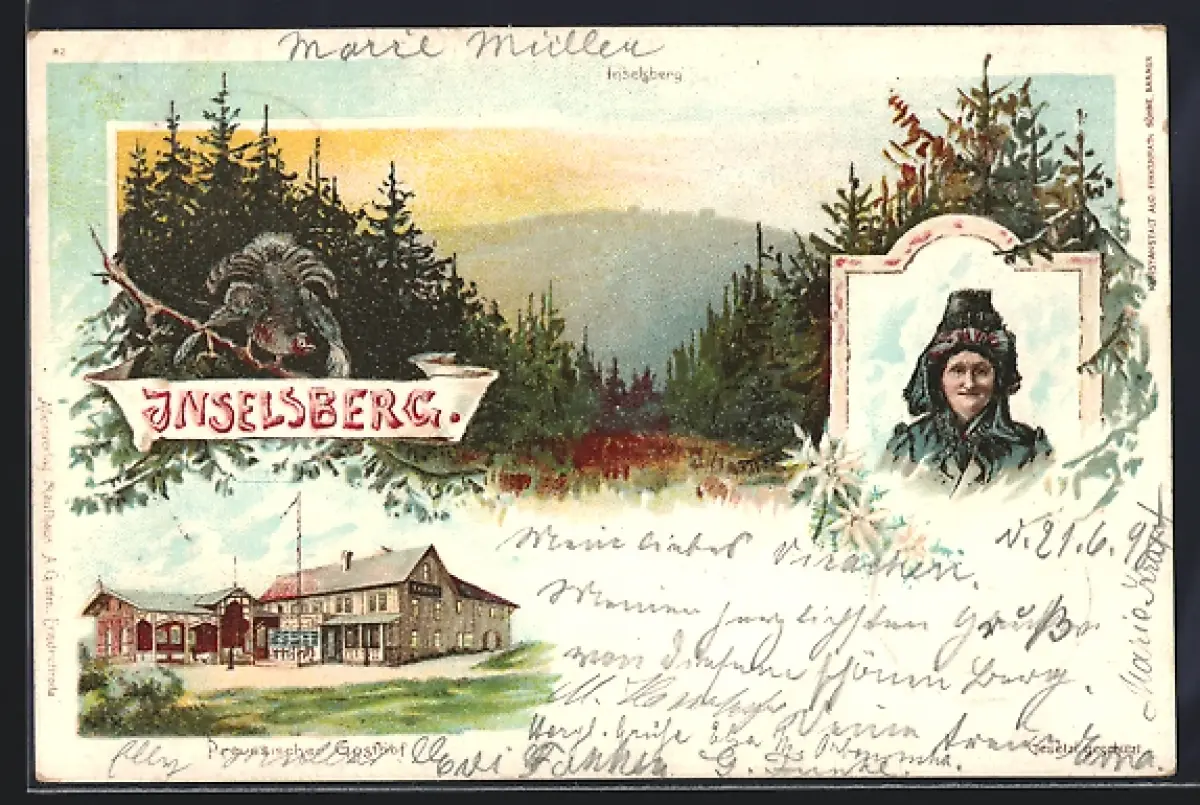 Lithographie Inselsberg, Bergpanorama, Gasthaus Inselsberg, Marie Müller