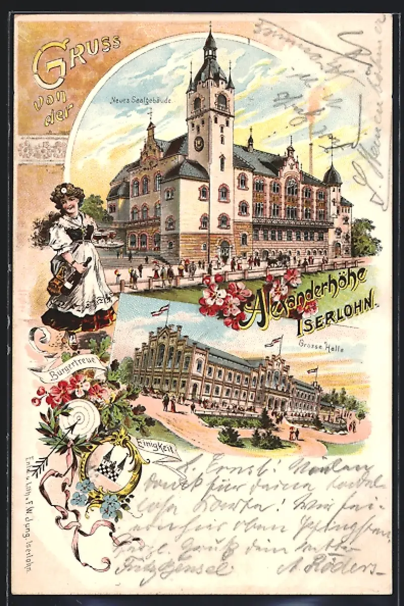 Lithographie Iserlohn, Alexanderhöhe, Neues Saalgebäude, Grosse Halle, Einigkeit