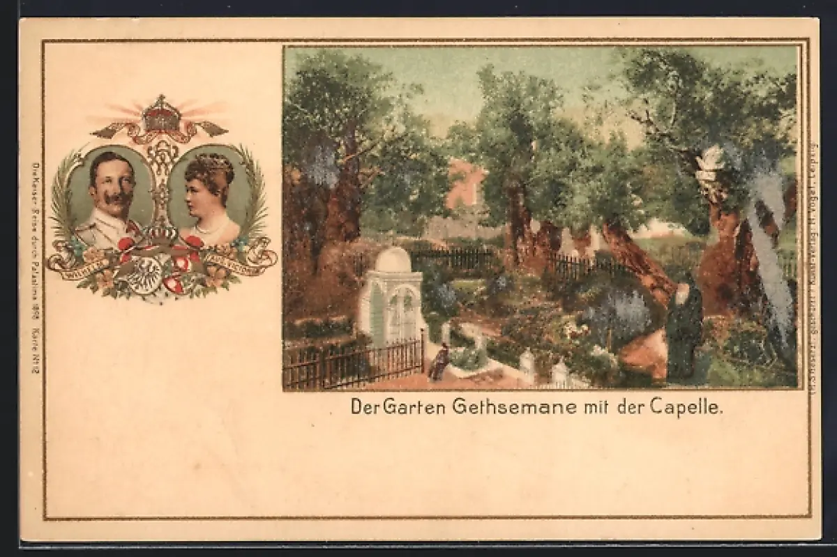Lithographie Jerusalem, der Garten Gethsemane mit der Kapelle, Portraits des Kaiserpaares