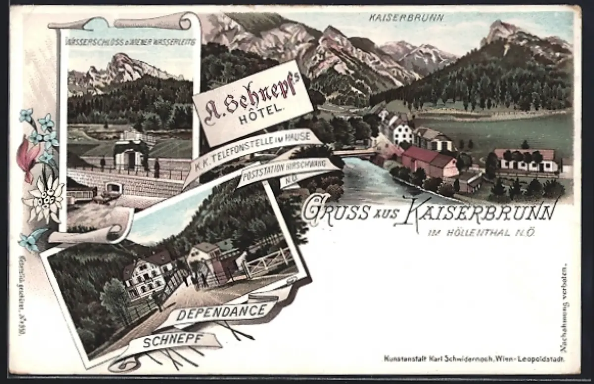 Lithographie Kaiserbrunn i. Höllenthal, A. Schnepfs Hotel, Wasserschloss d. Wiener Wasserleitg.