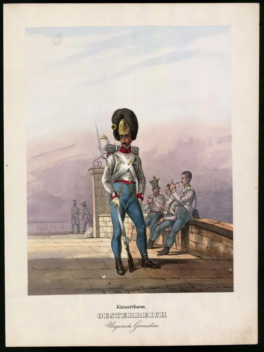 Lithographie Kaiserthum Österreich, Ungar. Grenadiere, altkoloriert, montiert, aus Eckert & Monten um 1840 Vorzugsausgab