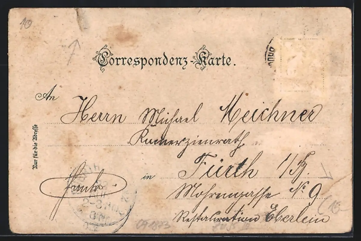 gelaufen, Briefmarke entfernt, rückseitig Oberflächenschaden, Bugspur und geklebter Einriss re. oben, Ecken bestoßen, guter Zustand