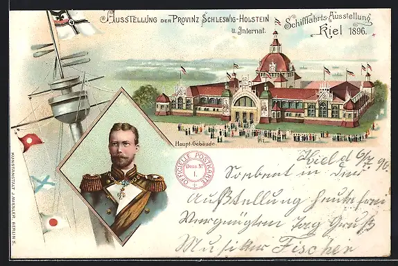 Lithographie Kiel, Ausstellung der Provinz Schleswig-Holstein u. Internat. Schifffahrts-Ausstellung 1896, Hauptgebäude