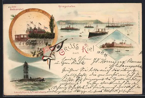Lithographie Kiel, Seebadeanstalt, Leuchtturm bei Friedrichsort, Kriegshafen